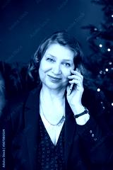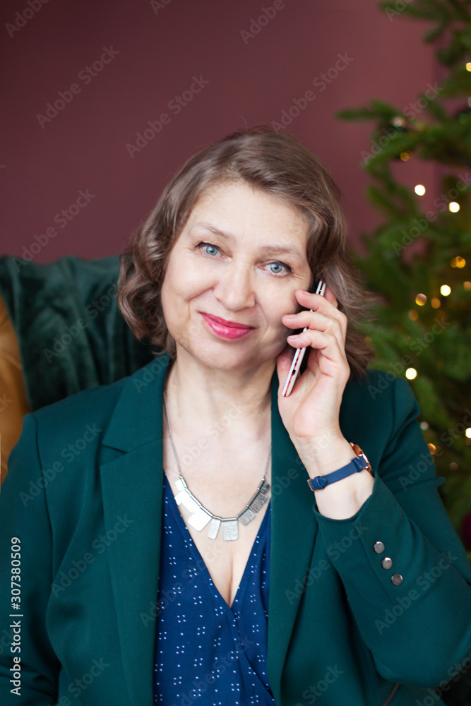 Grateful cheerful Mature woman is talking on the mobile phone and looking into the camera. Retired person has a call and wishes Merry Christmas to somebody. New Year celebration concept