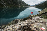 One Single Hiker in a Red Coat Standing at Lake Kartell above St. Anton at the Arlberg in Austria