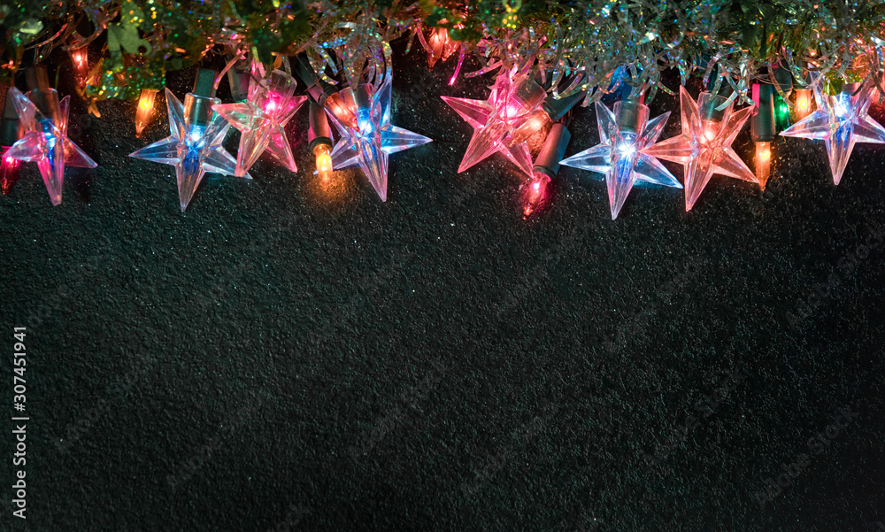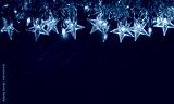 Warm star shaped light garlands, festive decorations with copy space. Christmas concept. Flat lay, top view