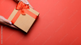 Woman manicured hands holding red and golden wrapped present or gift box on orange brown background, copy space, top view, flat lay. Background for Valentine's Day, Mother's Day.