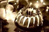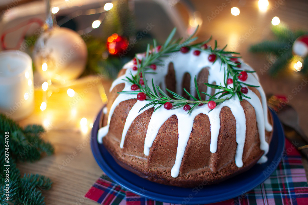 Christmas traditional pie close up. Festive food with winter holidays decoration on the table