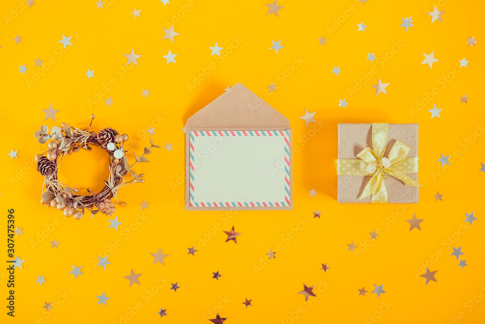 Top view festive composition with festive wreath, blank greeting card with envelope and decorated gift box on bright yellow background with sparkle stars.Vintage New year mockup. Flat lay. Copy space.