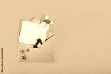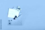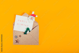 Top view festive composition with handmade stamp greeting card, santa clause pin in craft envelope with felt christmas tree and stars on bright yellow background. Flat lay, top view. Copy space.