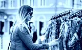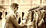 I want this. Attractive young woman buying at street market. Consumerism, fashion, lifestyle concept
