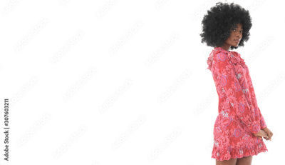 Beuatiful afro-american model in pink mini dress isolated on white background.