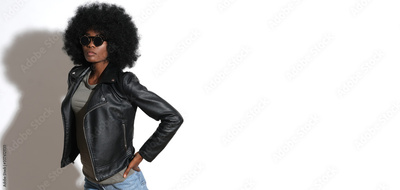Sexy afro girl in black leather, rocky jacket and black sunglasses isolated on white background.