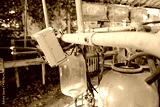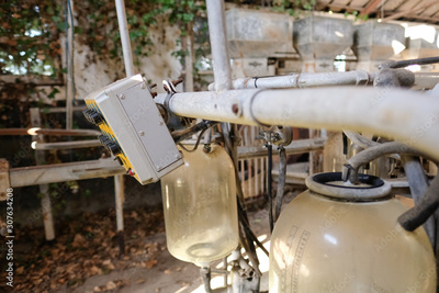 Shallow focus of a milking parlour flow control box and panel, seen near milk collection flasks. The dairy farm has long been abandoned due to a BSE outbreak.