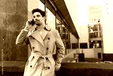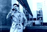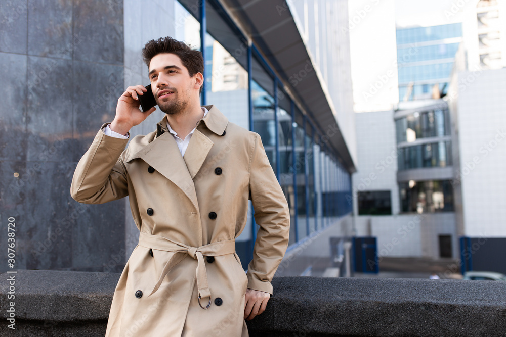 Young handsome casual man in trench coat talking on cellphone on street