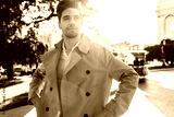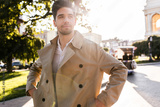 Portrait of attractive man in trench coat happily walking through city street