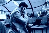 Side view of businessman in trench coat talking on cellphone working with laptop in cafe on street