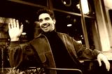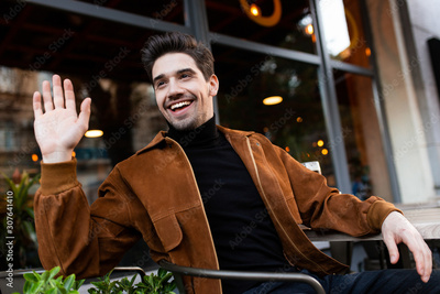 Young attractive cheerful casual man happily waving hand hello while resting in cafe on street