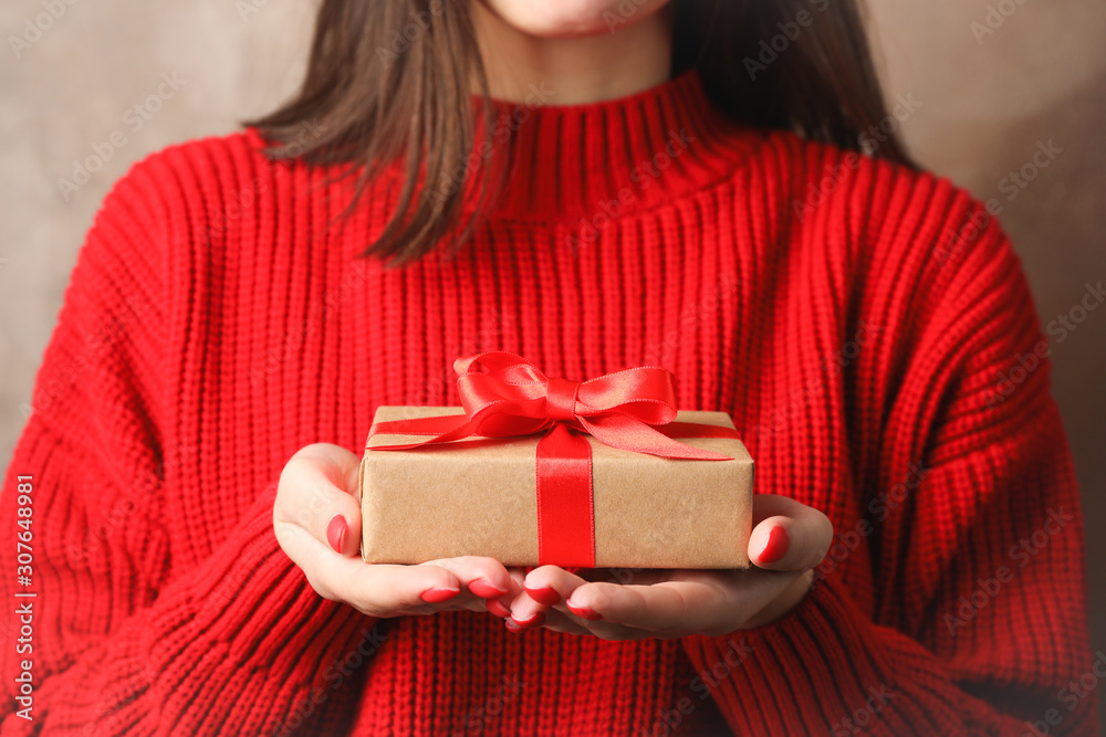 Young woman holding gift box, closeup. Space for text
