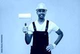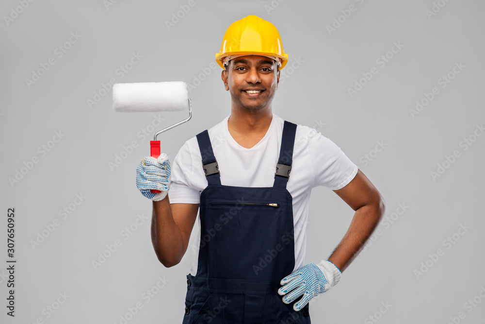 repair, construction and building - happy smiling indian builder or painter in helmet with paint roller over grey background