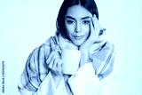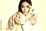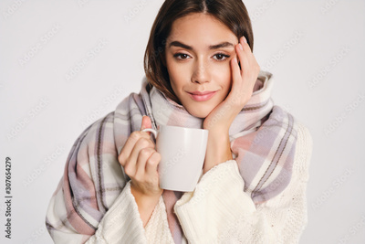 Portrait of pretty girl in sweater with scarf holding cup with warm drink dreamily looking in camera over white background