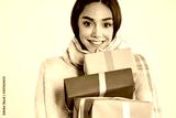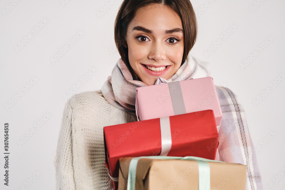 Portrait of attractive excited girl with scarf holding gift boxes happily looking in camera over white background