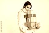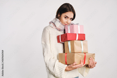 Beautiful cute girl in sweater with scarf holding gift boxes dreamily looking in camera over white background