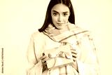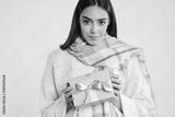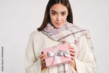 Portrait of pretty girl in sweater with scarf holding gift box intently looking in camera over white background