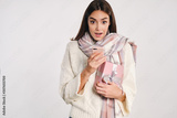 Attractive girl in sweater with scarf holding gift box and cellphone surprisingly looking in camera over white background