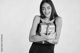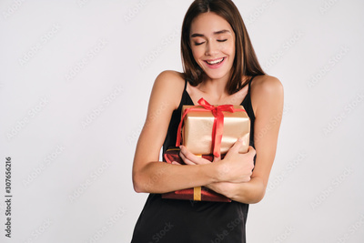Pretty positive stylish girl joyfully hugging gift box over white background isolated