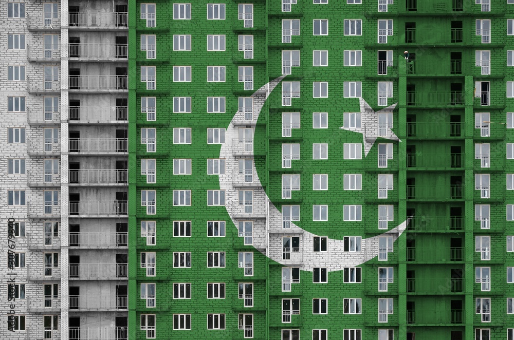 Pakistan flag depicted in paint colors on multi-storey residental building under construction. Textured banner on brick wall background