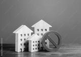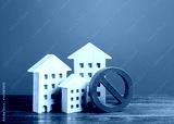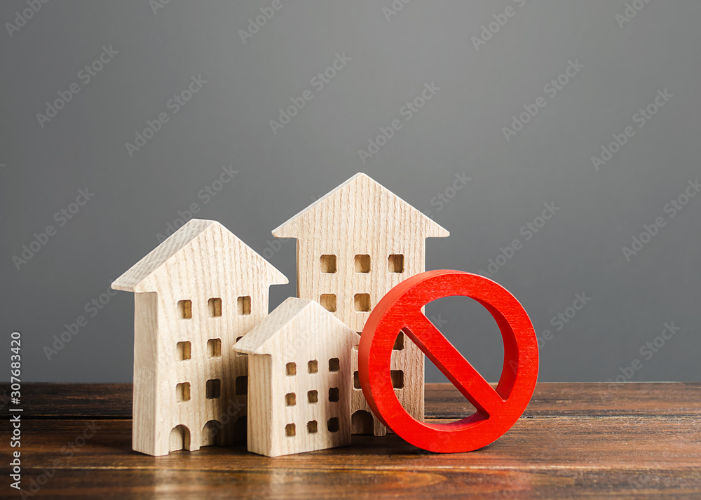 Apartment buildings and red prohibition symbol NO. Emergency and unsuitable for living building. Unavailable expensive housing. Lack of living space and the impossibility of building a new houses.