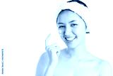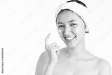 Asian woman apply cream, lotion to beautiful skin on face in bathroom. Young woman hold cream, apply moisturizer on face. Smiling Asia beautiful girl get happiness. She has nice skin. Skincare concept