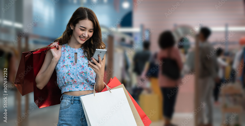 Shopping woman holding shopping bags looking on smartphone in shopping mall background.
