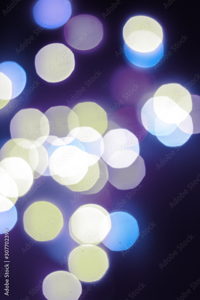 Blurred multicolor lights, dark background with space for text. Abstracted Christmas and New Year celebration template