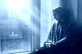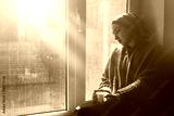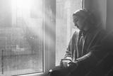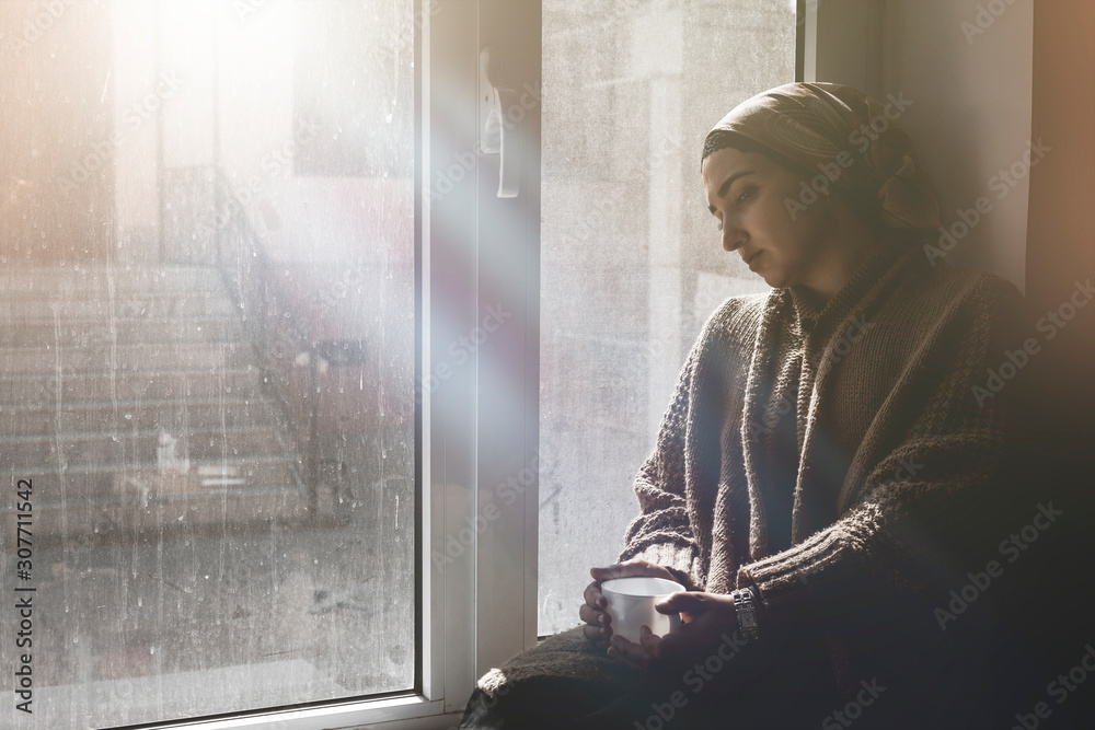 Young Muslim woman sits on window sill and looking away. Depressed middle-eastern female near the window at home. Lonely cheerless girl feeling stressed and waiting