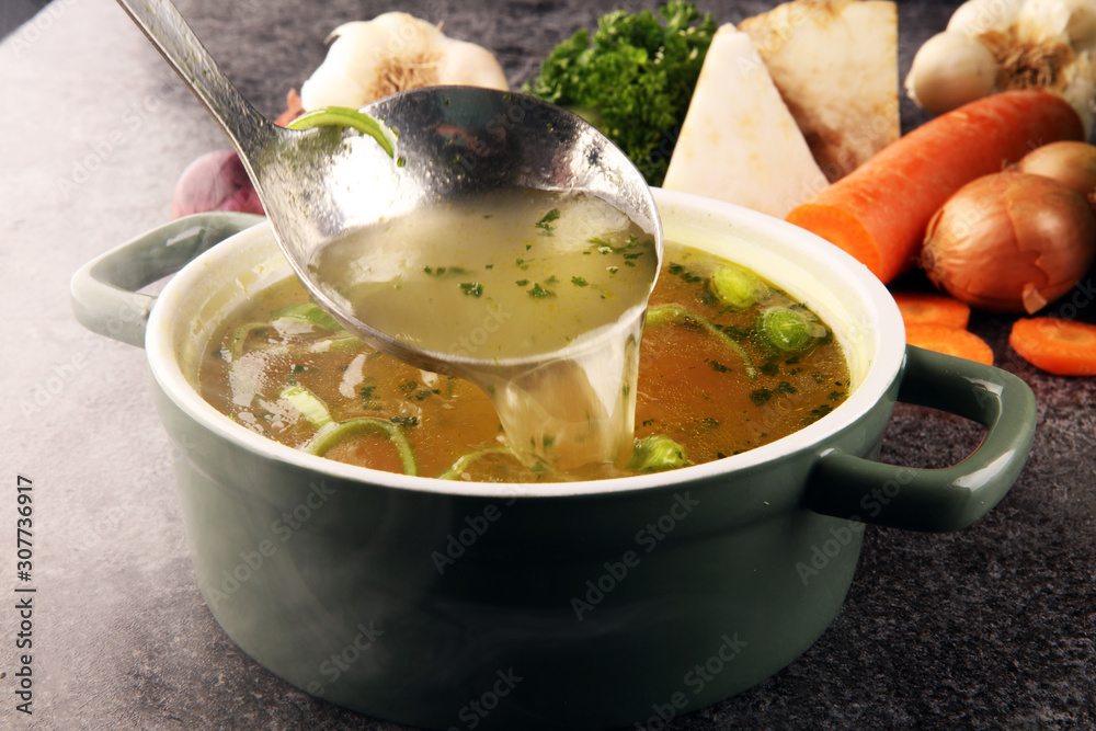 Broth with carrots, onions various fresh vegetables in a pot - colorful fresh clear spring soup. Rural kitchen scenery vegetarian bouillon stock