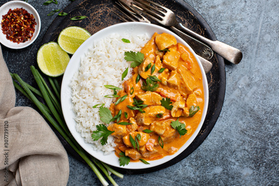 Chicken and cashew red curry with rice and herbs, thai inspired dish overhead view
