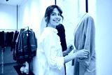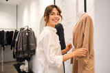 Young pretty smiling woman working in workshop happily looking in camera while making fitting of new collection on mannequin