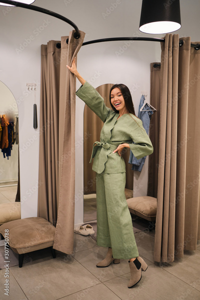 Pretty cheerful Asian girl trying on stylish suit in dressing room of clothes store