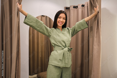 Attractive smiling Asian girl in stylish suit joyfully posing in dressing room of clothes store