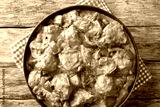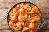 Mafe is a famous and popular West African dish cooked chicken in spicy peanut sauce close-up in a plate. Horizontal top view