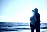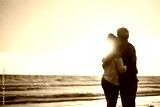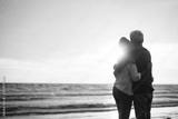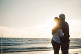 Romantic hugging couple enjoy the sunset on the beach. Back view.