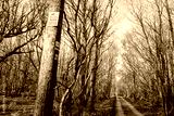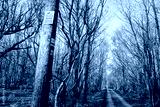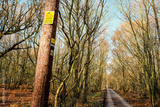Newly installed CCTV warning sign seen high on a wooden telegraph pole. Located in public parkland, by a rural lane, prone to criminal activity.