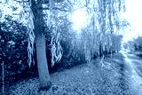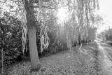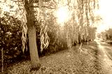 Bright winter sun seen breaking through a mature willow tree seen at the edge of a rural road in the UK