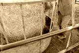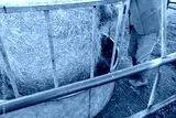 Dairy farmer seen pulling at a newly installed roll of hay used for winter feed for cattle.