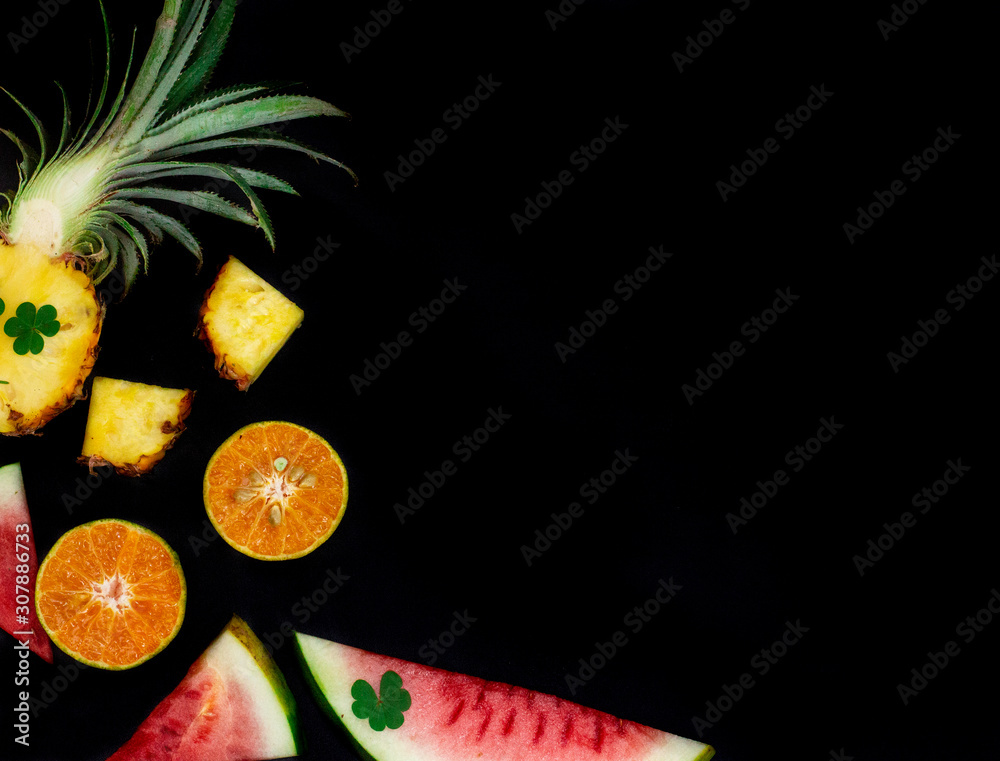 exotic tropical fruits, pineapple, orange, watermelon isolated on a yellow background