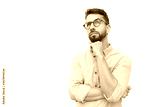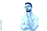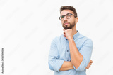 Pensive customer thinking over special offer, touching chin, looking up. Handsome young man in casual shirt and glasses standing isolated over white background. Advertising concept