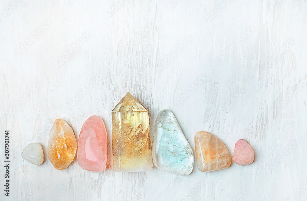Set gemstones crystal minerals for relaxation and meditation. Magic Rock crystal for Crystal Ritual, Witchcraft, Relaxing Chakra, aura readings. flat lay, copy space