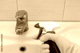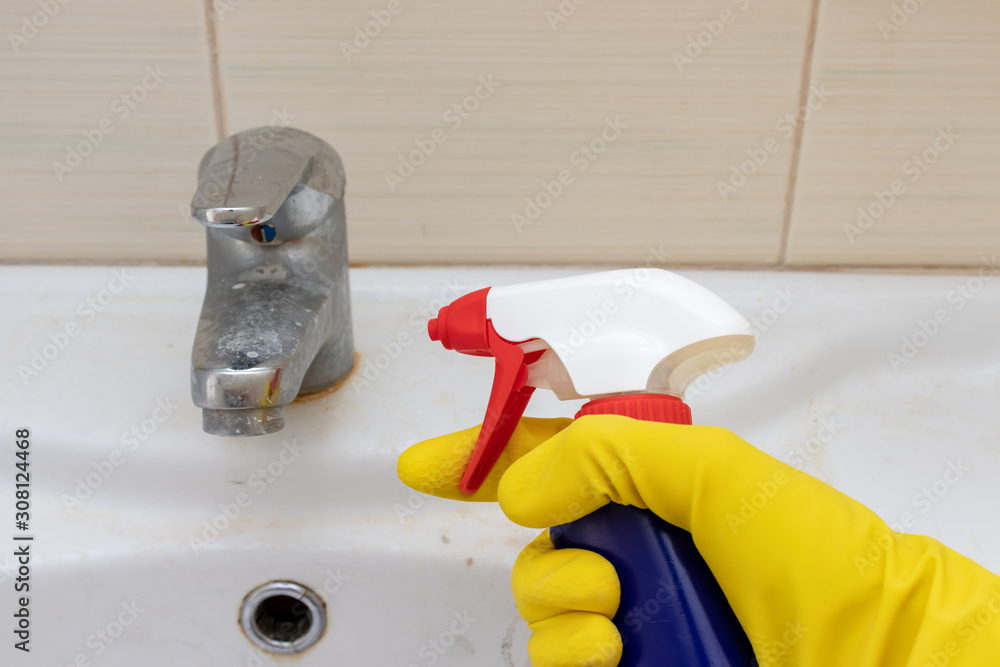 Hand in yellow rubber gloves holding a spray liquid cleaning agent for washing dirty faucet with limescale, calcified water tap with lime scale on washbowl in bathroom, house cleaning concept