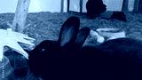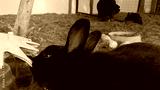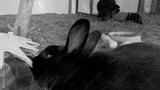 A cute furry black rabbit bunny in a cage at animal farm close up
