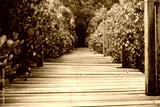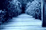 Long wooden path or wooden bridge among vibrant green mangrove forest, Rayong province, Thailand