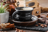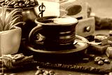 Coffee in a cup and saucer on an old background.