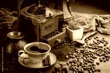 Coffee in a cup and saucer on an old background.