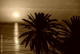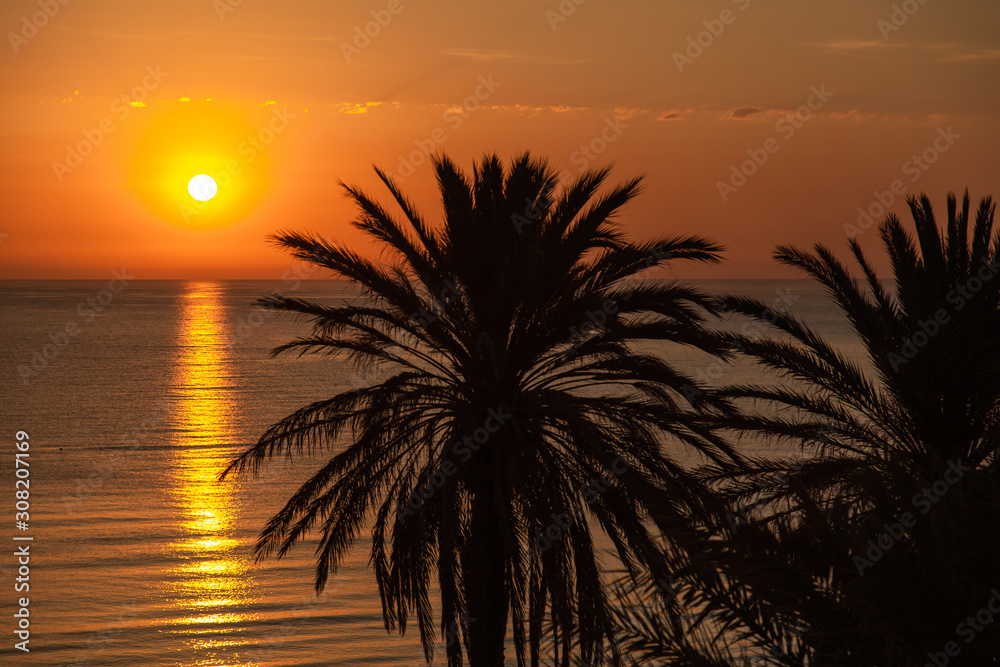 Beautiful amazing peaceful early morning at tropical beach. Golden sunrise sky, sea water with sunlight reflected in water and silhouettes of green palms growing at tropical beach. Color photography.
