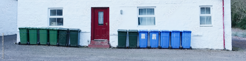 Green and blue wheelie bins in a row on street outside house waiting for bin men to collect panoramic
