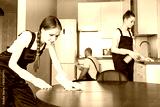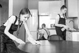 Cleaning service with professional equipment during work. professional kitchenette cleaning, sofa dry cleaning, window and floor washing. man and women in uniform, overalls and rubber gloves